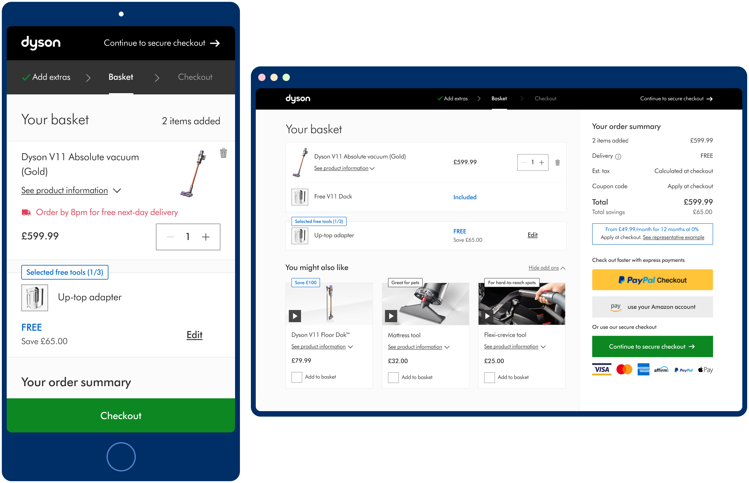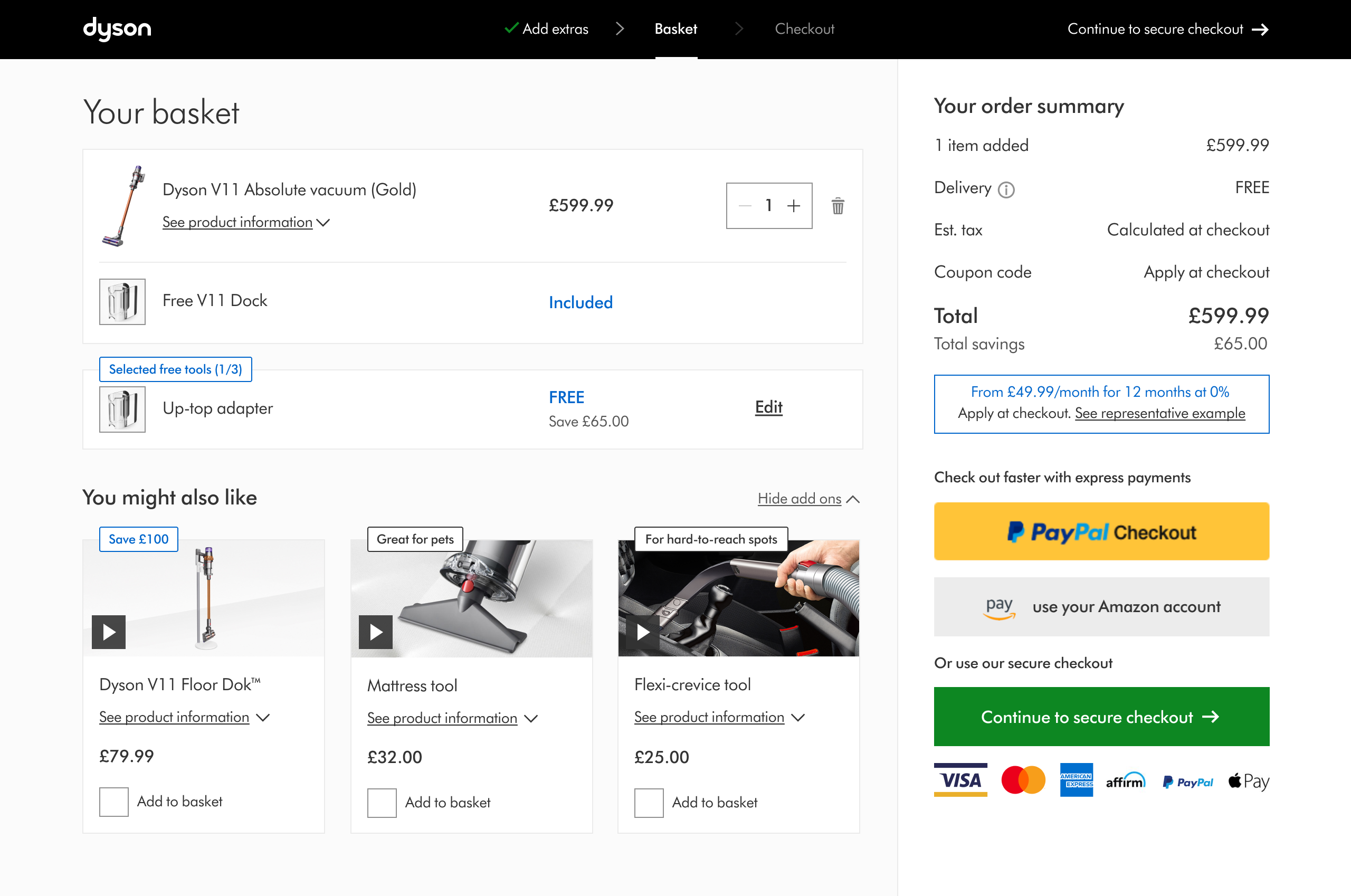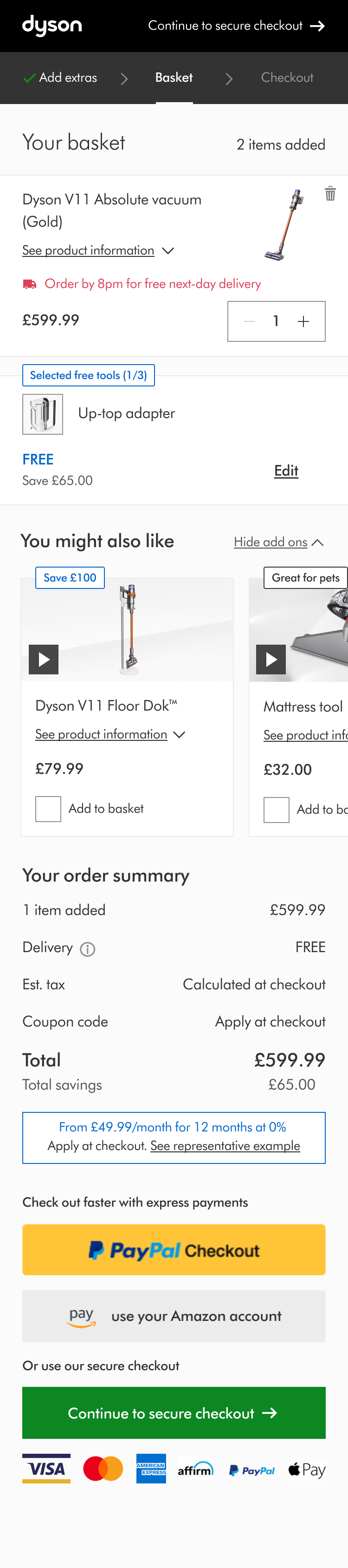 Ahead of Dyson’s peak trading period, the product team wanted to ensure the basket experience was as optimised as possible for conversion. Our team was tasked in taking on a full research, design and development project to be delivered before peak.