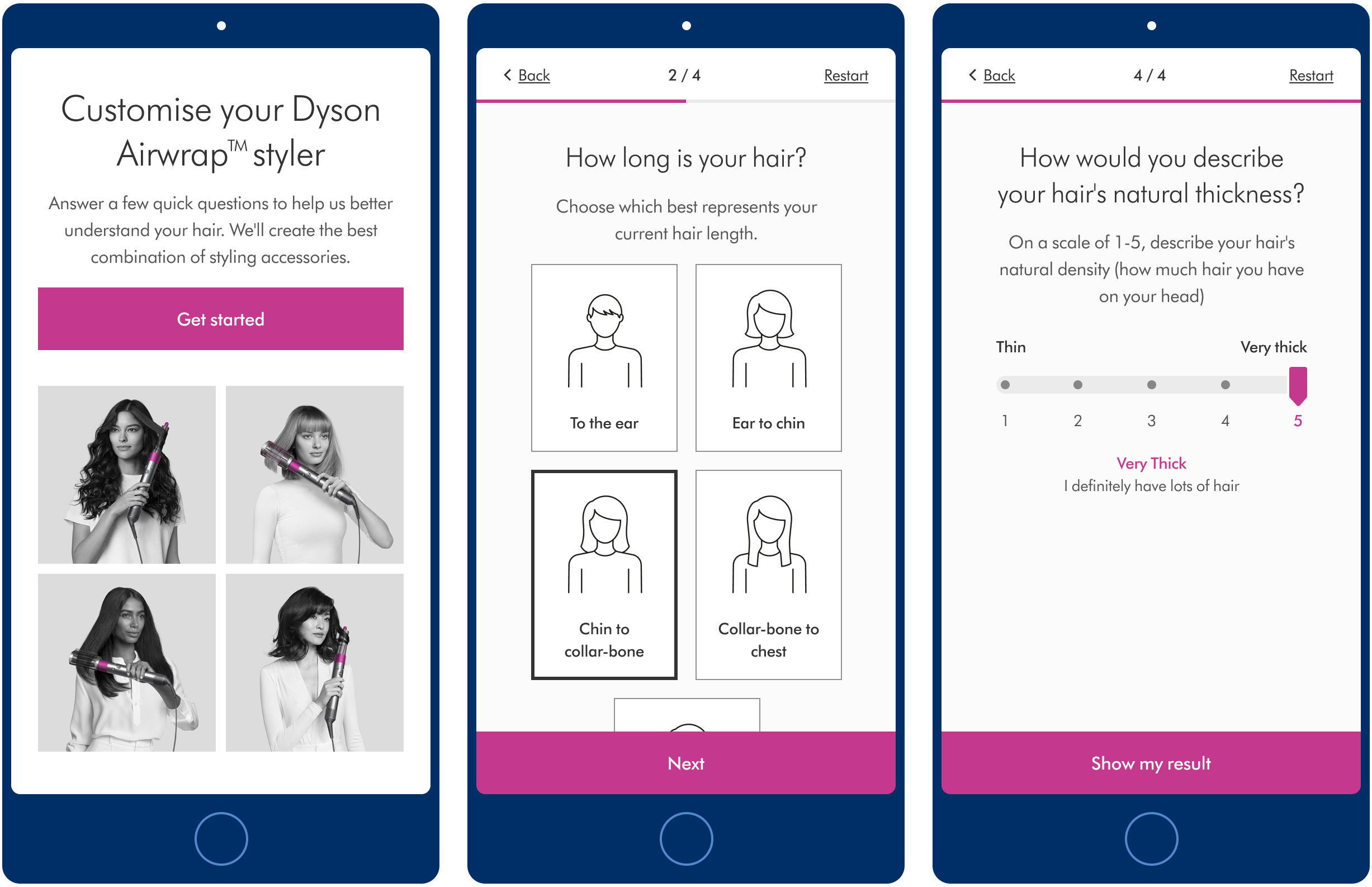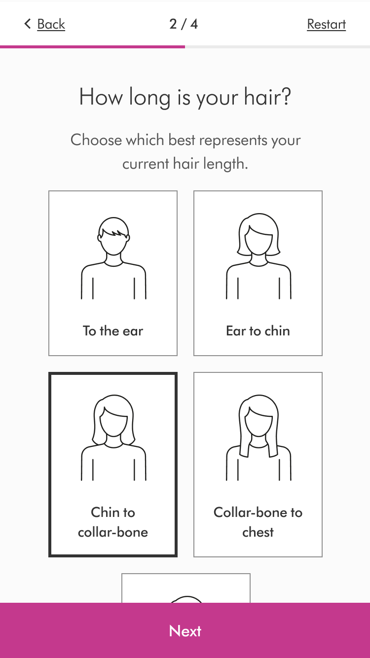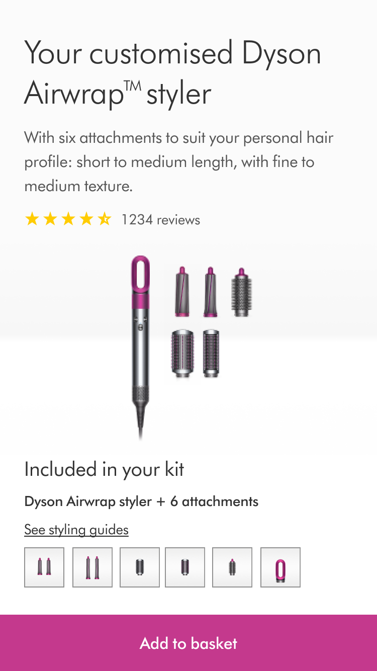 Traditionally, Dyson’s primary progression buttons on web were green, but the version launched in Retail stores was already fuchsia, which matched the product. We ran a couple of short usability test during UI refinement to see which aided progression, but participants in both studies seemed to progress at a similar pace. So once we launched, we ran an A/B test with live traffic, and learned pretty quickly that the fuchsia button aided progression.