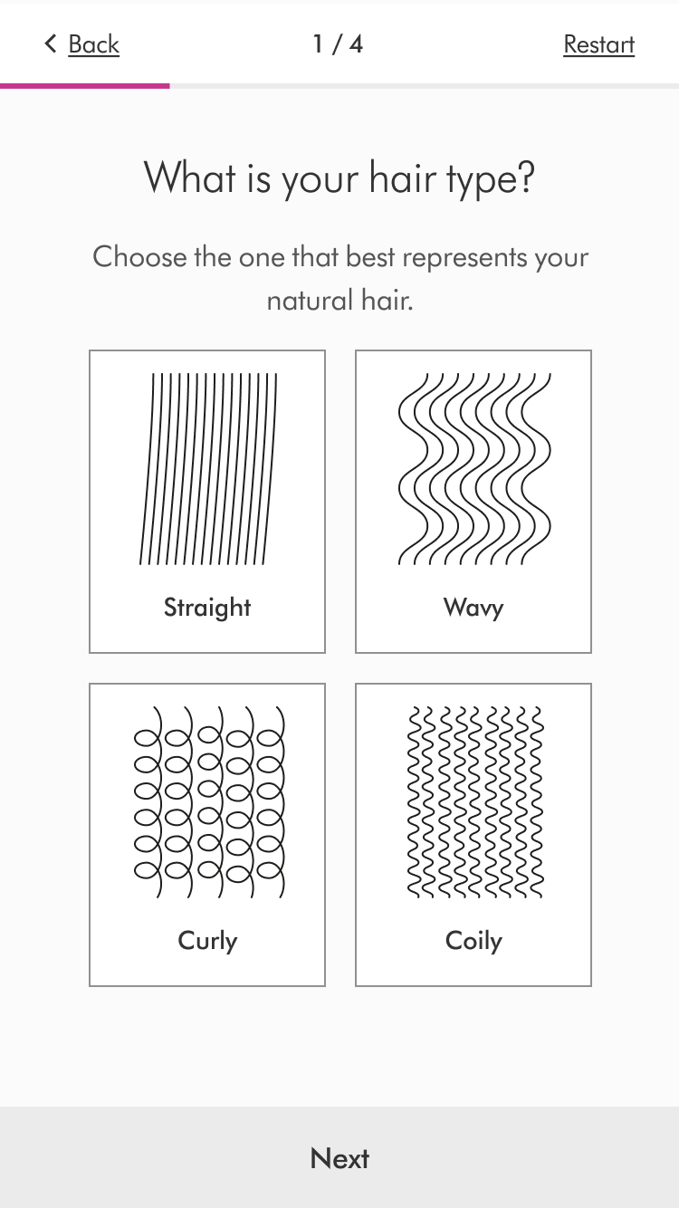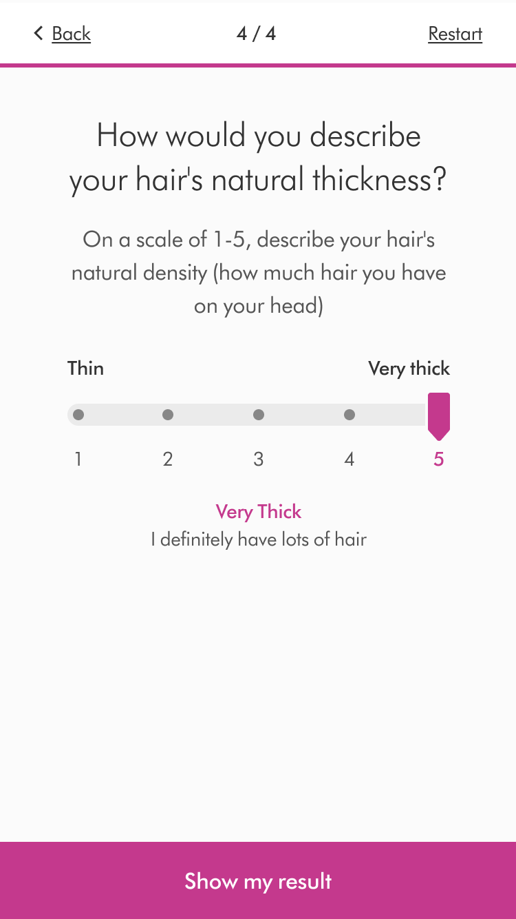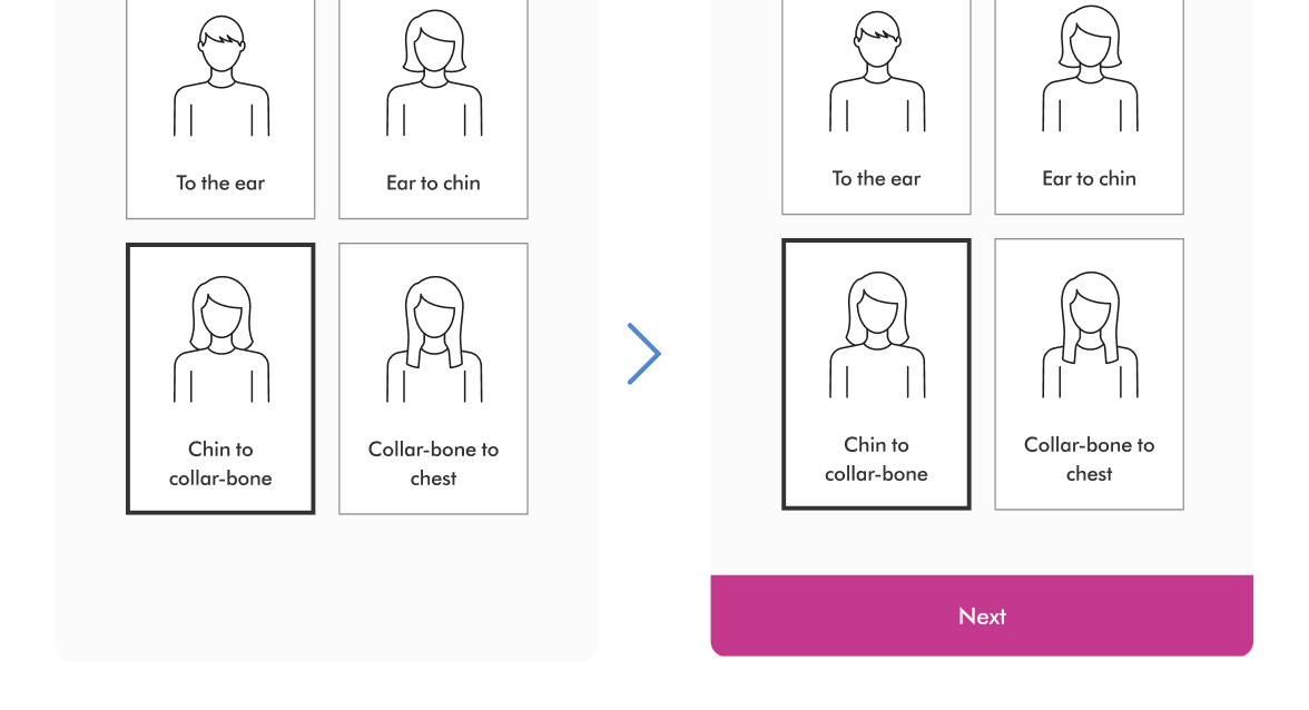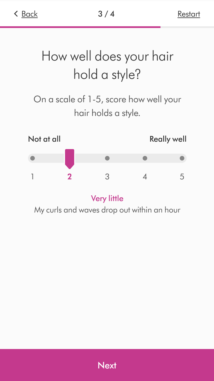 In the retail version, selecting an answer would automatically move the user onto the next question, to aid speed of progression. However after refining the logic, we had three answer types - single selection, range/scale selection and multi-select. There was no way of knowing when a user had finished multi-select question, therefore we would need to provide a ‘confirm’ button to progress. As a result, we decided to enable the ‘Confirm/next’ button on all screens for consistency.