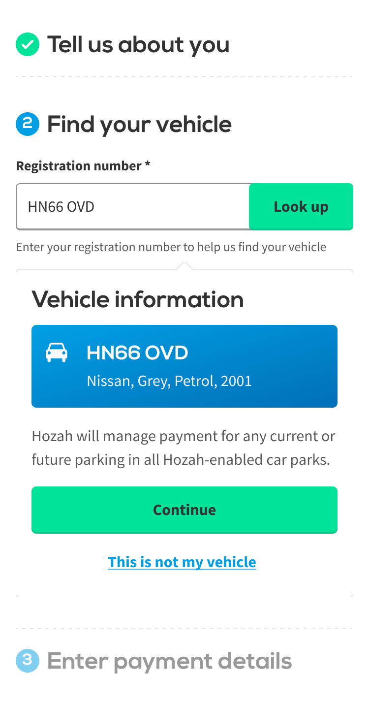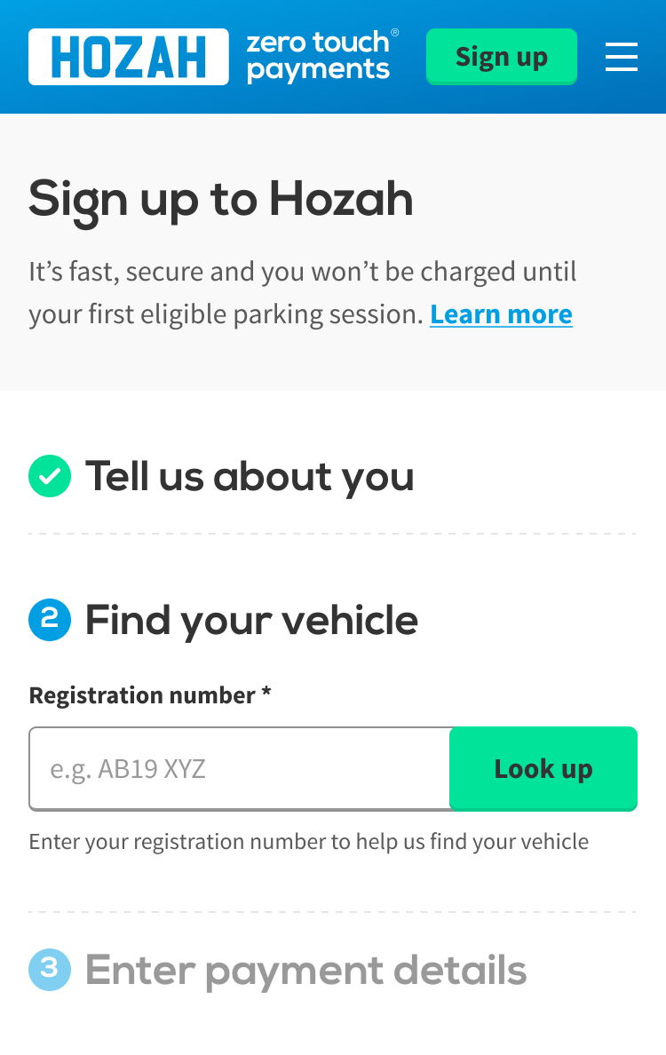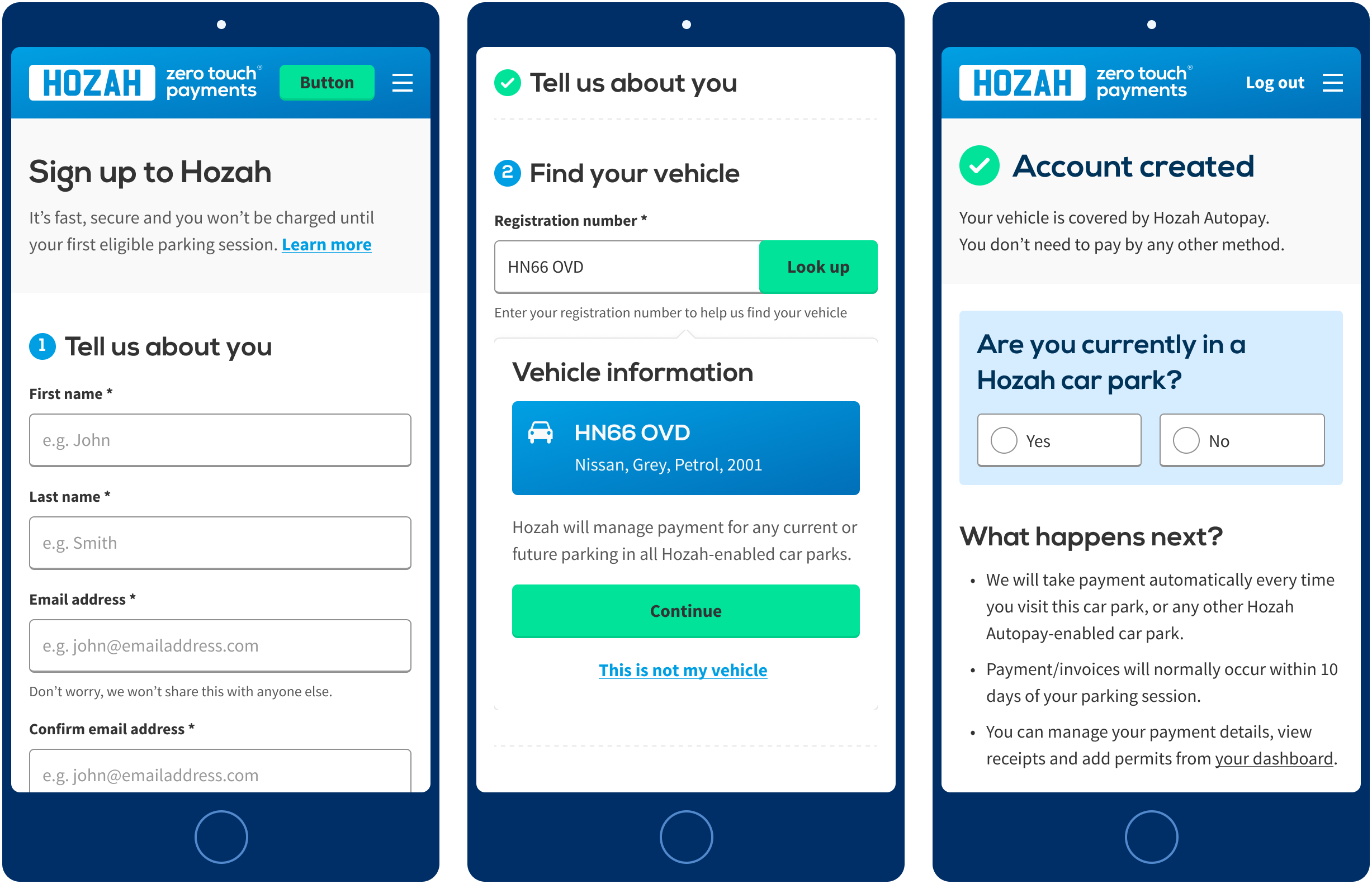 Hozah needed to refresh the sign up journey for their Autopay product - a service which allows users to pay for parking automatically. The existing journey was split over multiple payments, with inconsistent UI throughout.