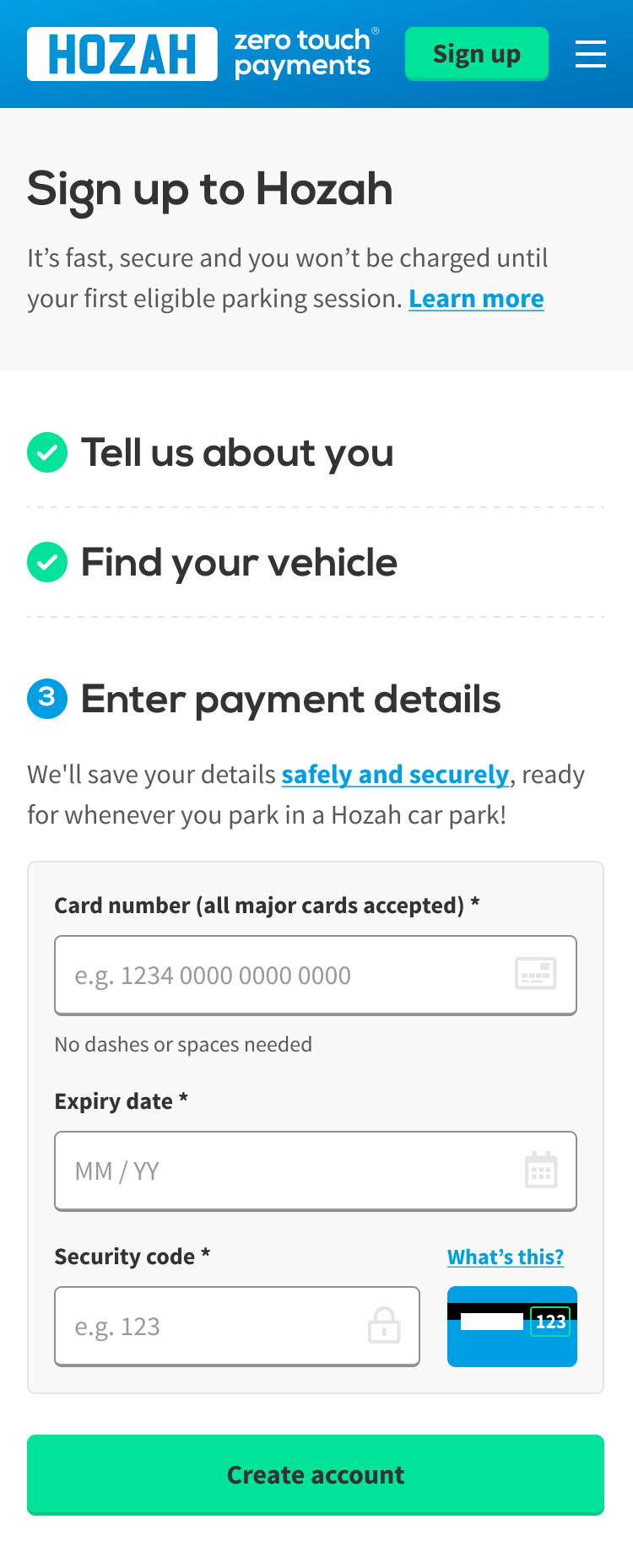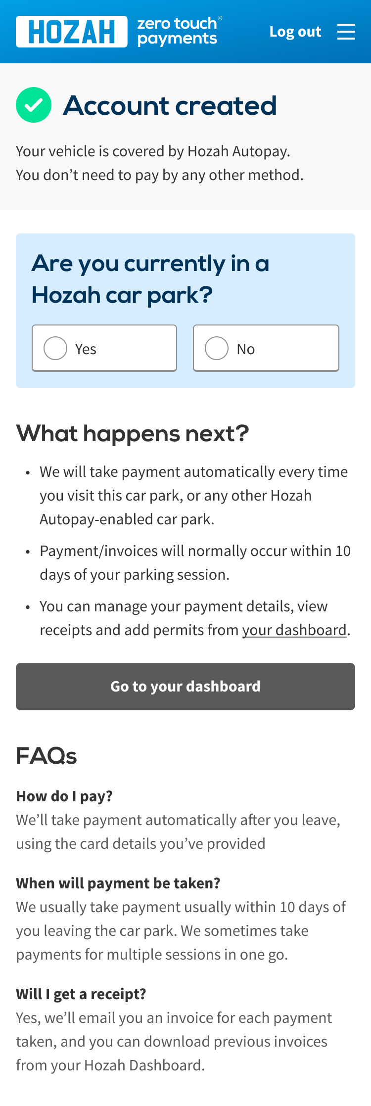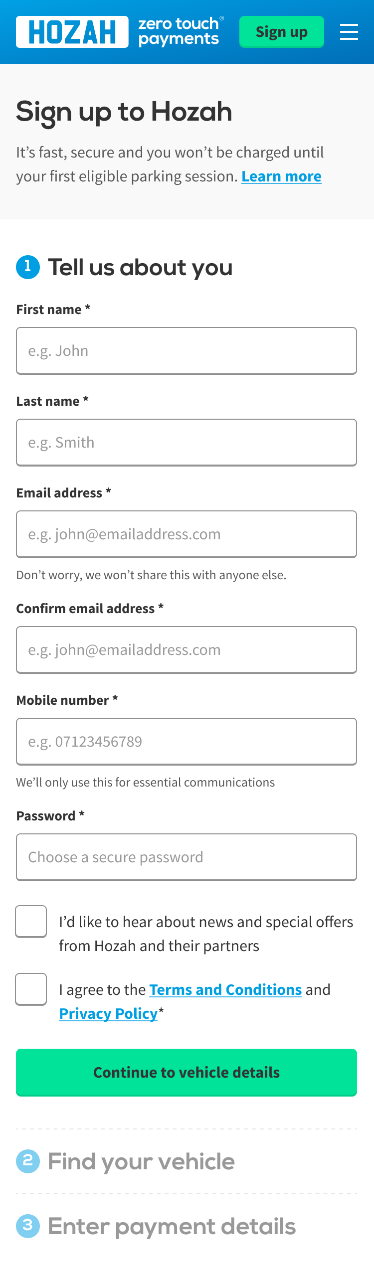 Hozah needed to refresh the sign up journey for their Autopay product - a service which allows users to pay for parking automatically. The existing journey was split over multiple payments, with inconsistent UI throughout.